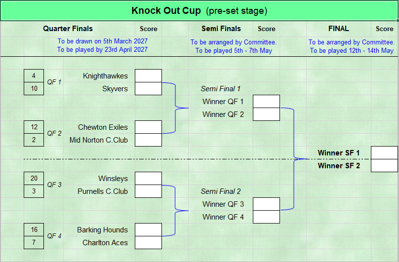 Quarter Final draw made on Friday 6th March - All Q/F's to be played by Friday 24th April.